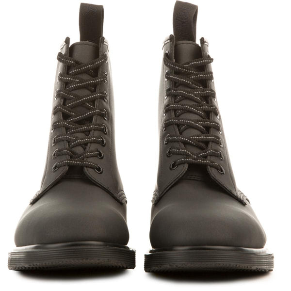 <p><span>During daylight, the boot appears to be allover black—but in fact, have panels of Glassine, a textured embossed material with strikingly reflective properties. It’s vampy street goth at its finest; and while they look great at all times of day, they’re the most fun after dark.</span><br /><br /><span>This Whiton unisex boot is made with Glassine, a synthetic nubuck with a reflective finish on top. It has all the DNA of a classic Doc—it’s Goodyear welted, meaning the upper and sole are sewn together in our heat-sealed z-welt stitch for enhanced comfort, but uses a compound called Ranil. That, along with its design, is why it’s so lightweight. Also, this Whiton includes a SoftWair Technology Sole for extra comfort.</span></p> <p> </p>