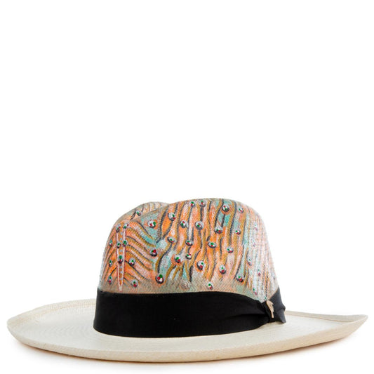 These hats are hand-selected for their utility, style, quality, and elegance. The hats are made in Colombia by the world-famous artisans who carry the centuries-old tradition of making hats. Colombian-made Panama hats are famous world-over for their quality and style. Each hat is then hand-painted by the world-renowned Colombian painter Dr. Bedoya. Each one of these hats is a unique piece of art and there is no other like it. These are sure to become a collector's item.