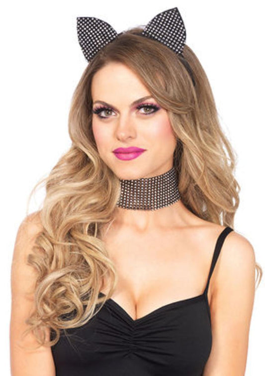 2PC.Rhinestone cat ear headband and choker set in BLACK
