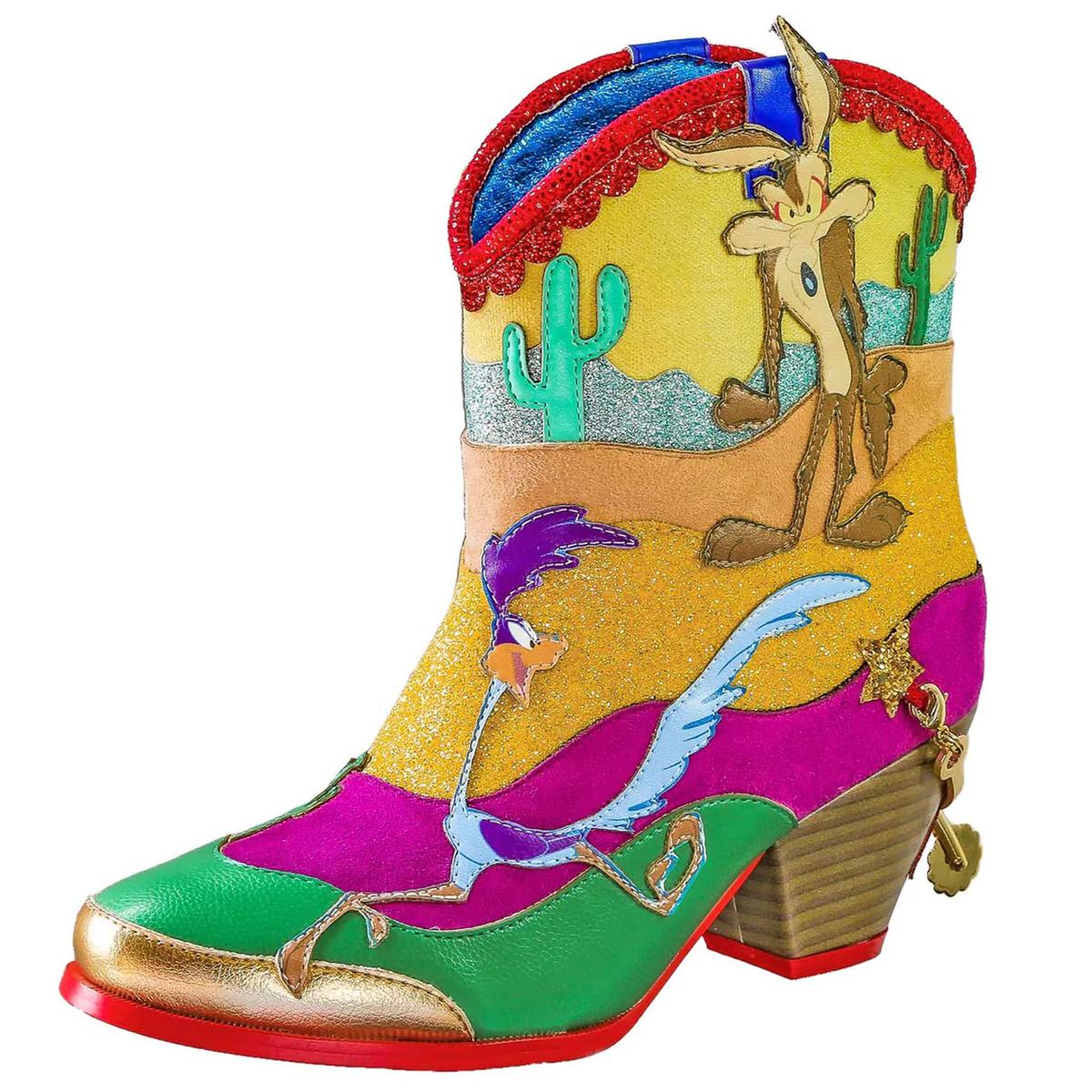 Are you feeling like the rootinest tootinest fashionista around? Slide into these cowboy boots and shoe everyone who is sheriff! Featuring western inspired Looney Tunes characters, Wile E Coyote, Roadrunner, Speedy Gonzalez, and Yosemite Sam, these gorgeous boots are sure to cause a stir wherever you wear them! Topped off with spurs on the heels and a gorgeous southwestern silhouette, these beauties are sure to become fast faves in your collection!