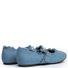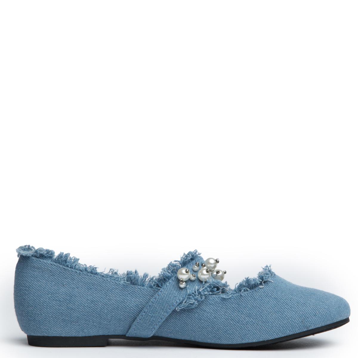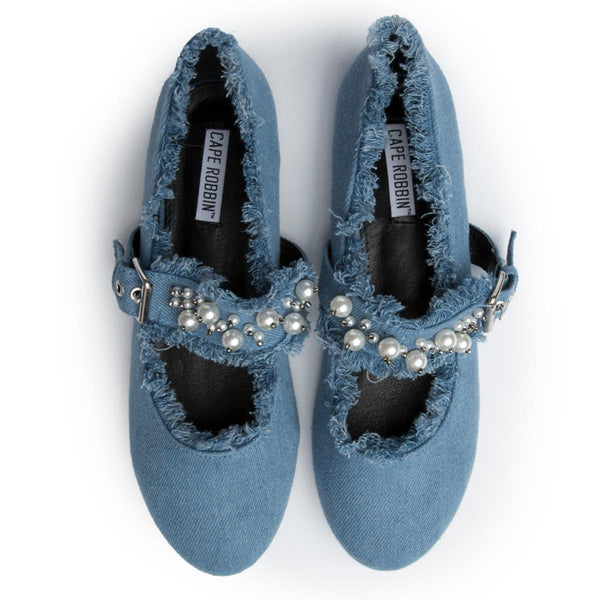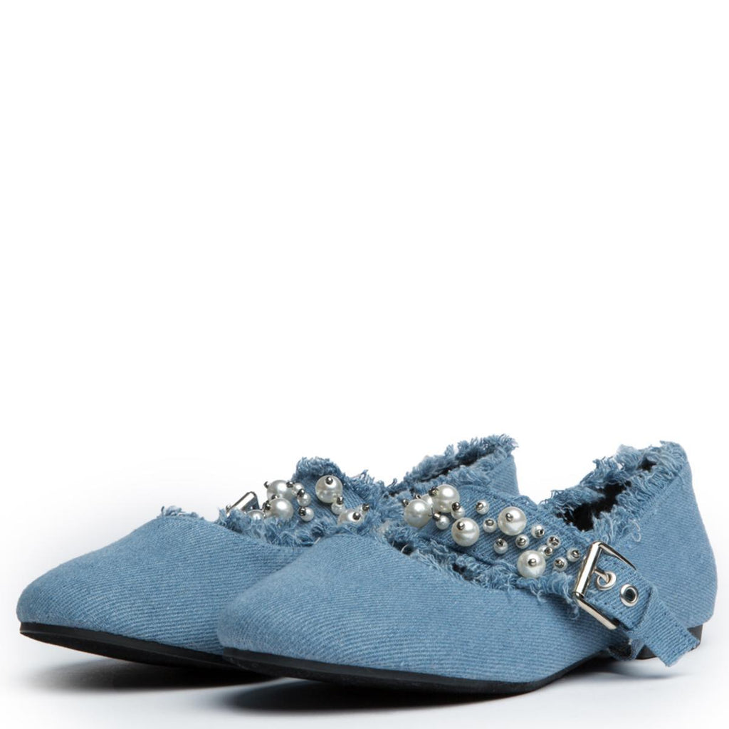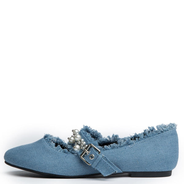 When it comes to that all around the way type shoe you can definitely count on the Penny-1. This flat features a denim upper, raw edges, and pearls on the strap. The shoe has a dressy appeal, but can still be worn for casual occasions.