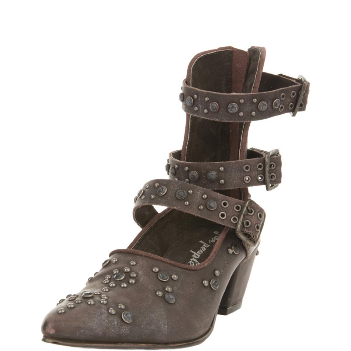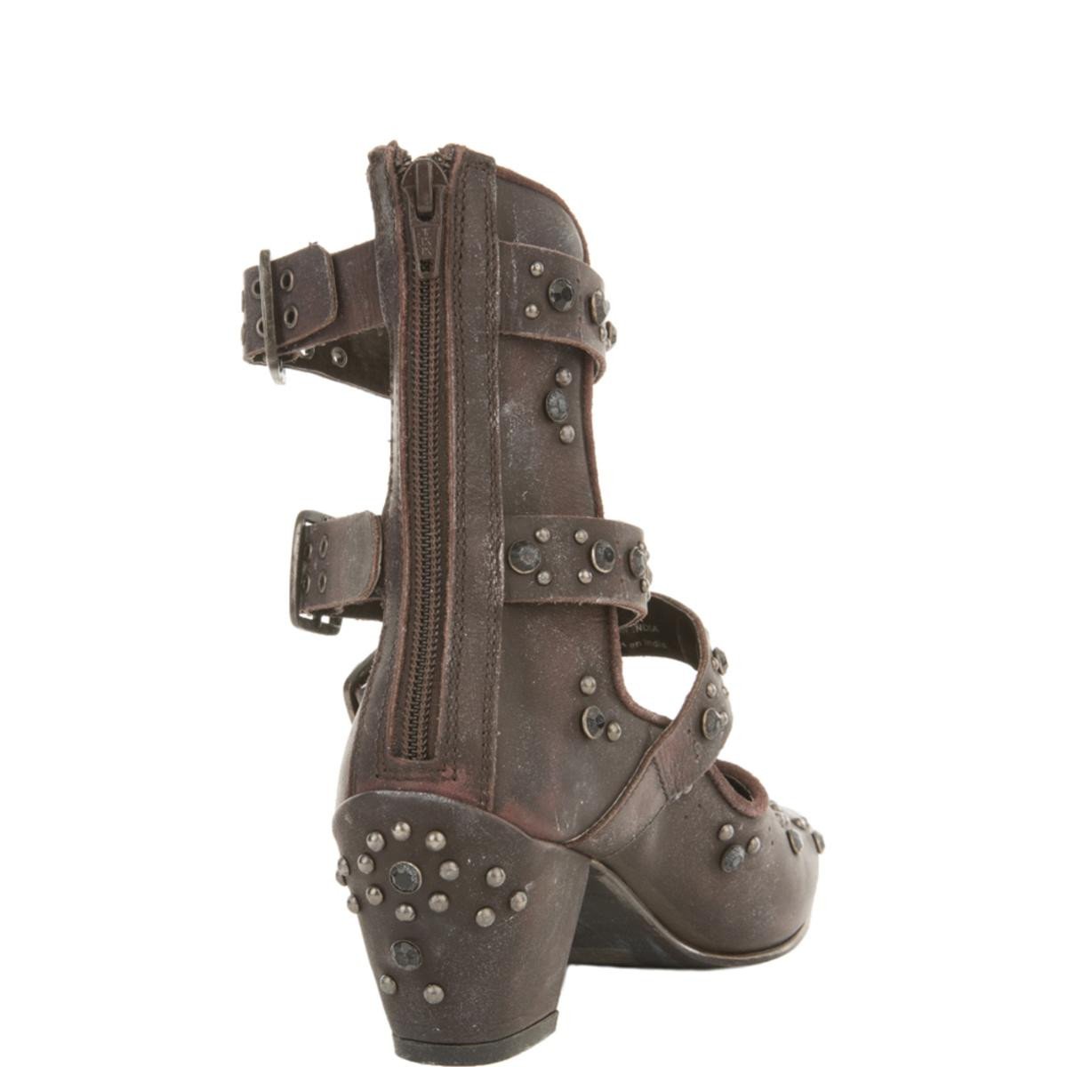 Chic ankle boot with a sleek pointed toe design and western-inspired studded accents. Features distressing for a perfectly worn-in look. Open at the front with three adjustable belt details. Padded footbed and chunky block heel for a comfortable step. Exposed back zipper closure creates an easy on-off.