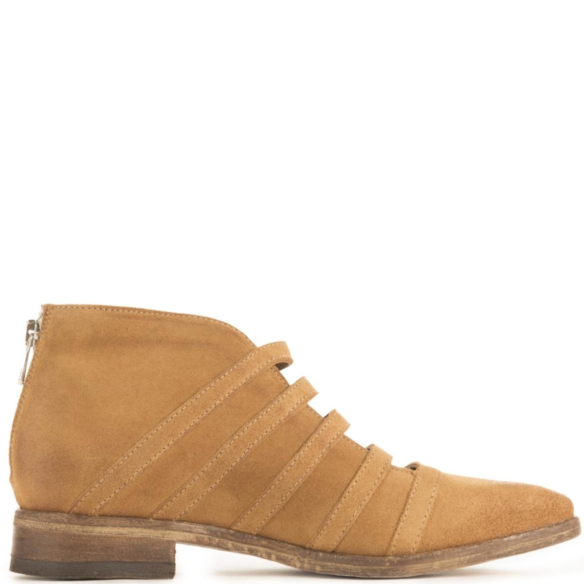 Distressed ankle boots featuring a luxe leather or sumptuous suede fabrication and strappy exposed silhouette. Back zip closure for an easy on-off. Stacked heel.