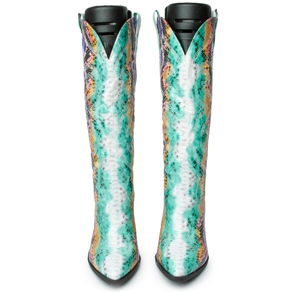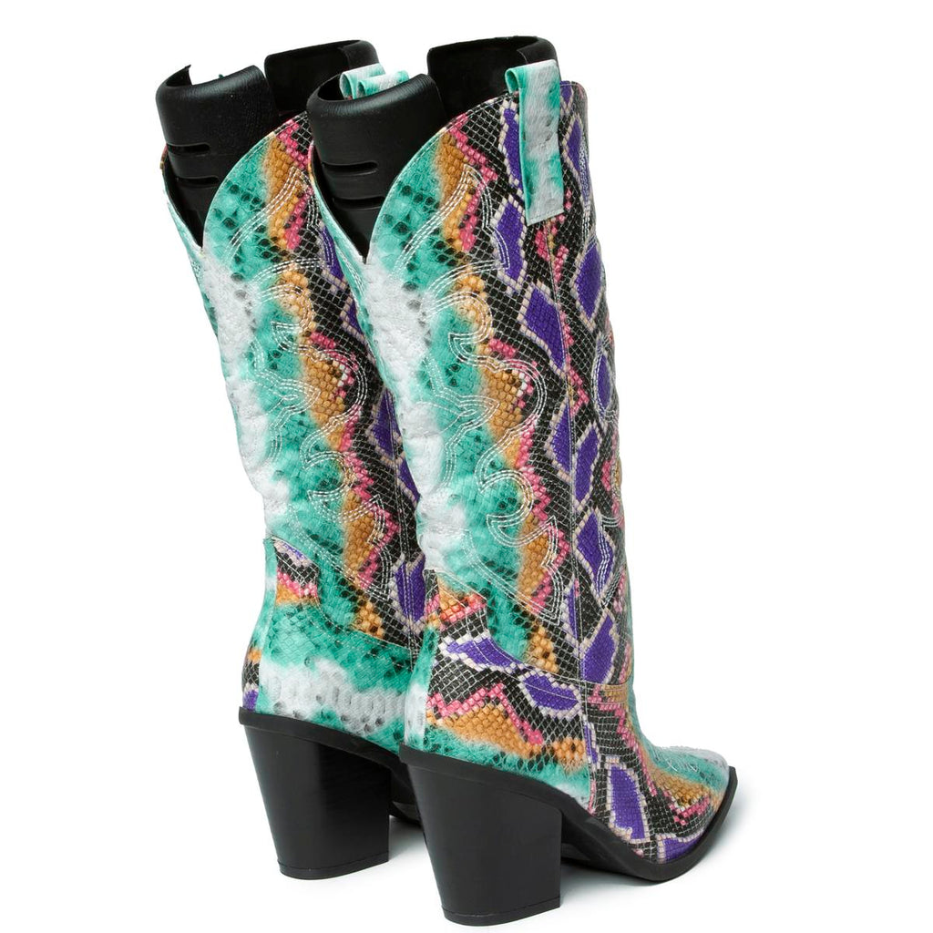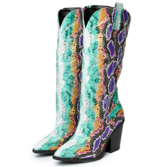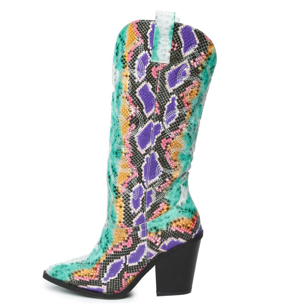 Add eye-catching appeal to your skirts or skinny jeans with the Samara-1 Mid High Cowboy Boot. This knee high features a bold snake print upper and chunky block heel for modern style.