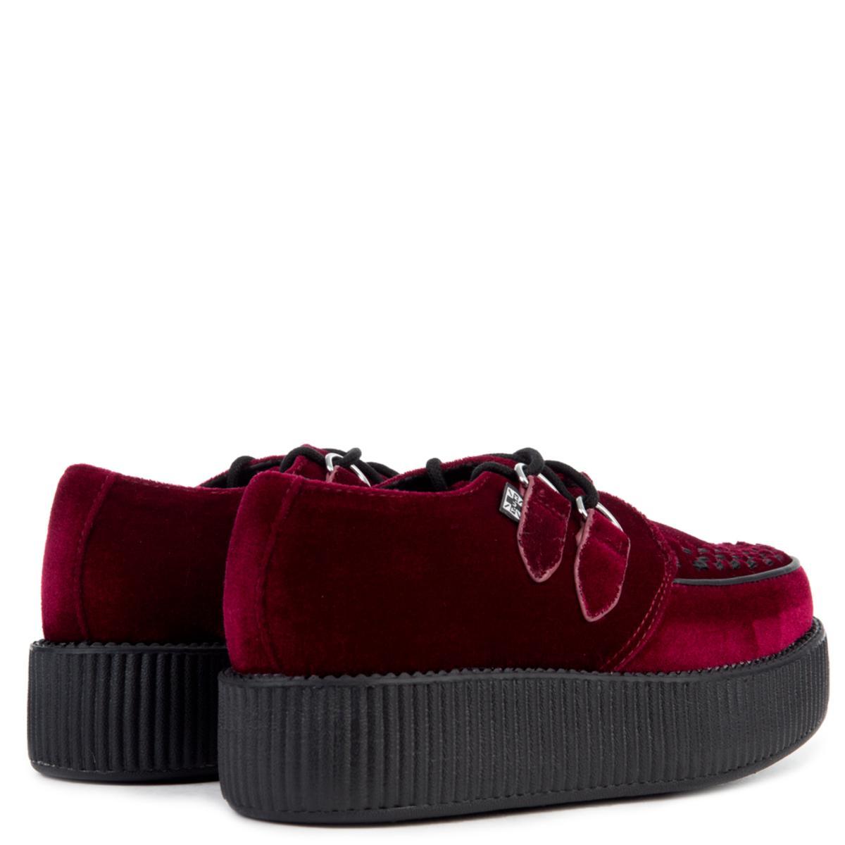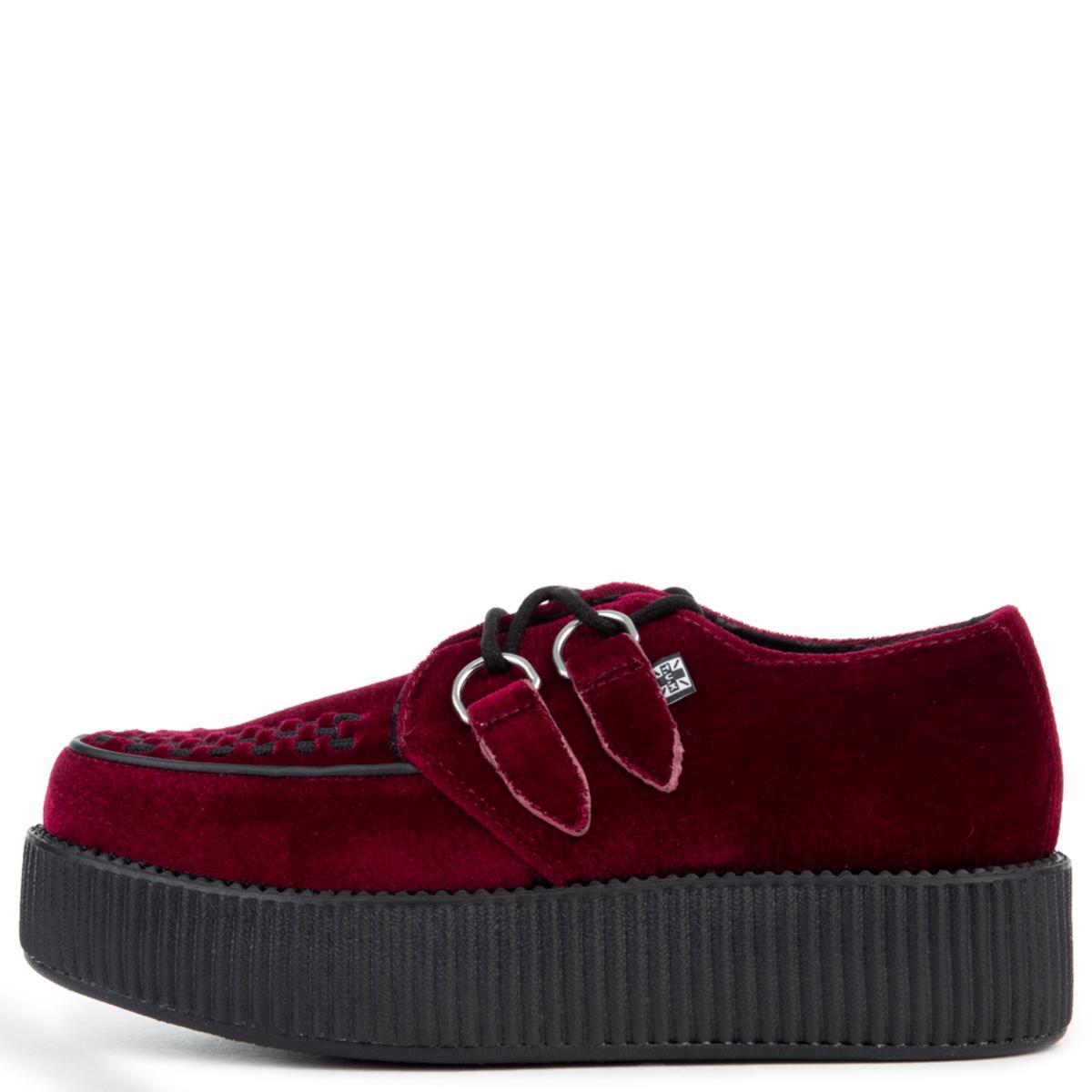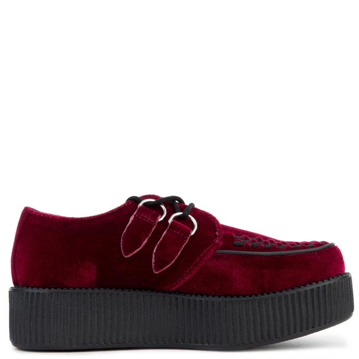 T.U.K: Burgundy Velvet Viva Mondo Creeper. These Burgundy Velvet T.U.K. Mondo Sole Viva Creepers feature the new lightweight and more flexible soles in our traditional 1 7/8". These creepers feature burgundy velvet throughout with black interlace, binding and silver metal d-rings for lacing up. Black mondo sole is nearly 2 inches high.