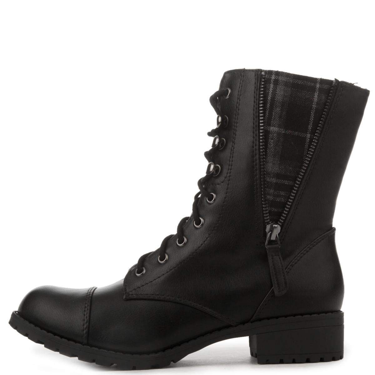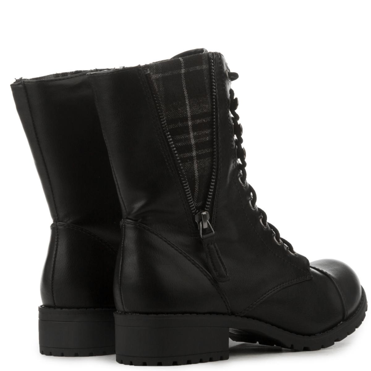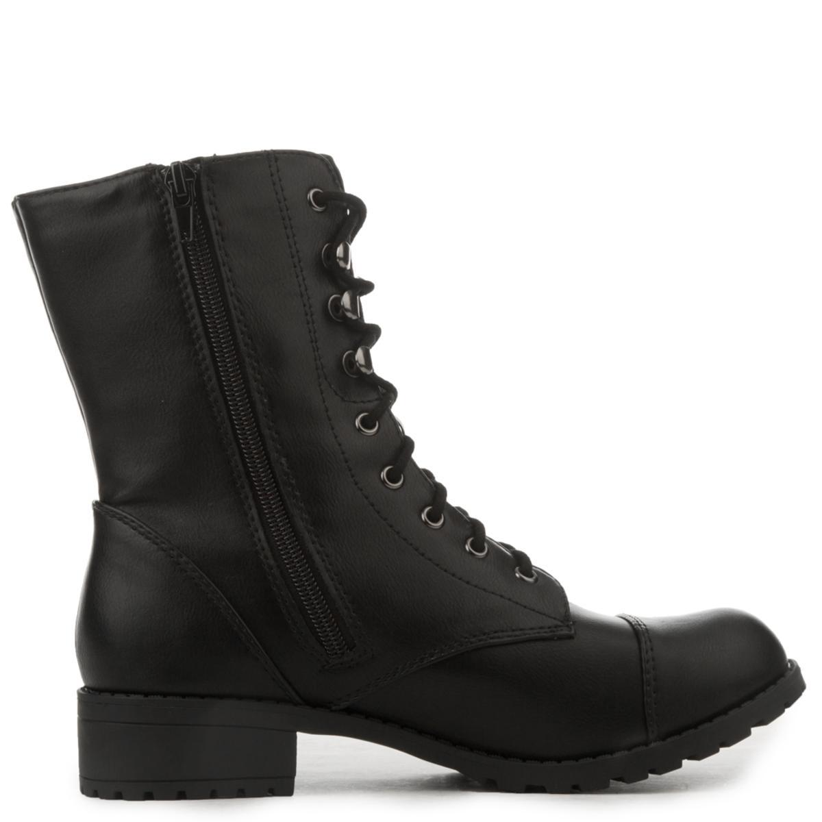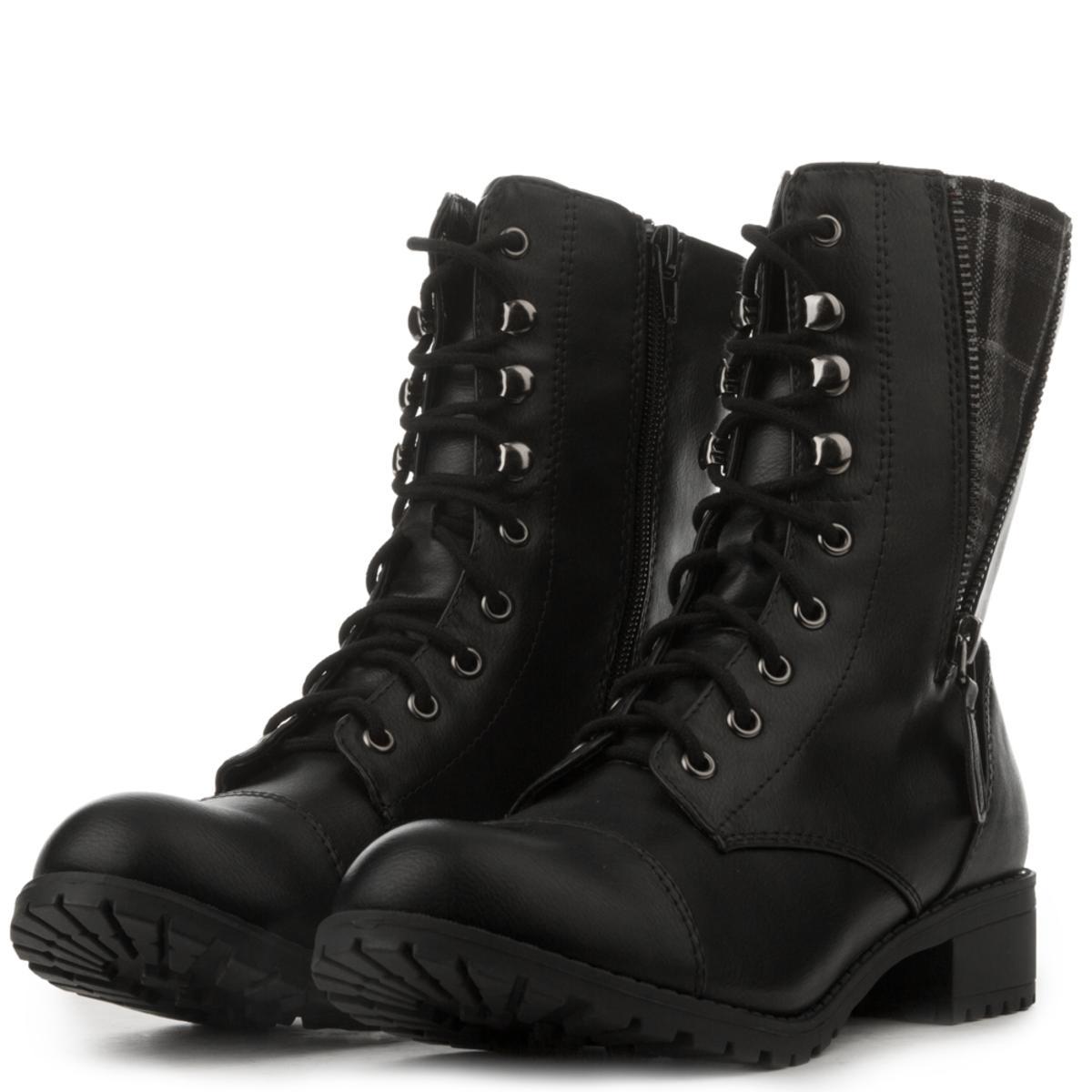 Lace up, mid calf, combat-inspired boots from the Soda collection. The Footer-S combat boot pairs well with slim pants and a loose blouse.