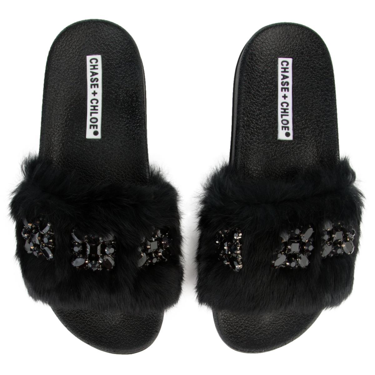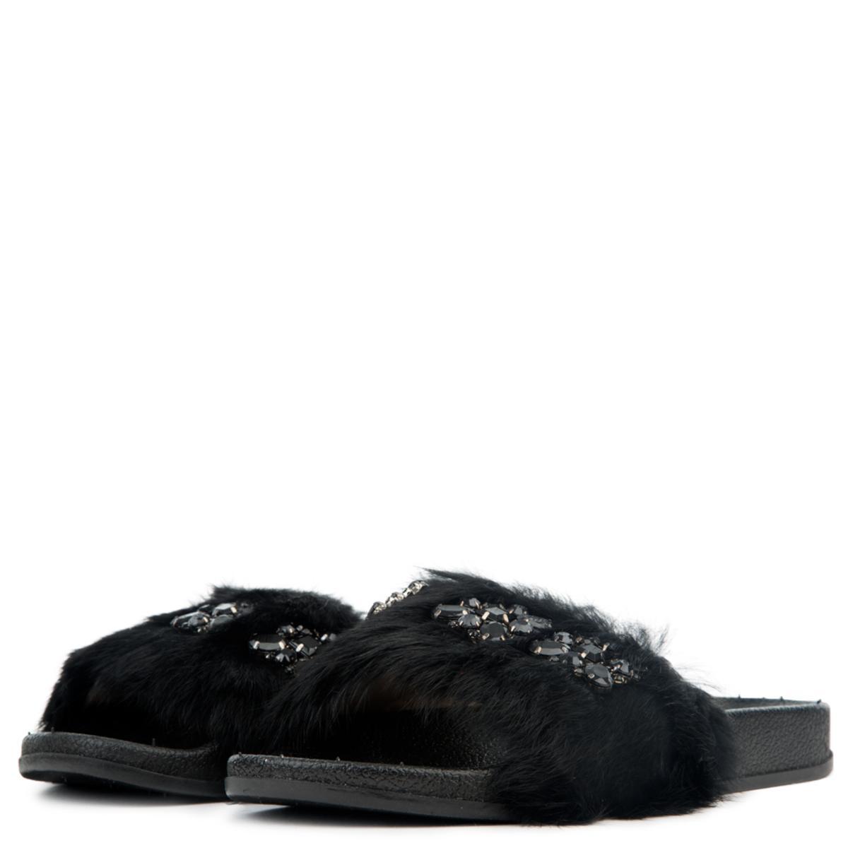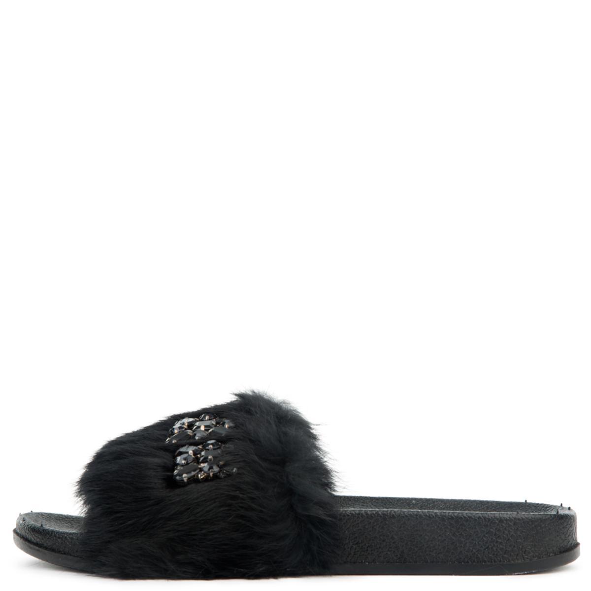 Slide into these comfortable faux fur slides, they come with jeweled detailing. Perfect to dress them ether up or down!